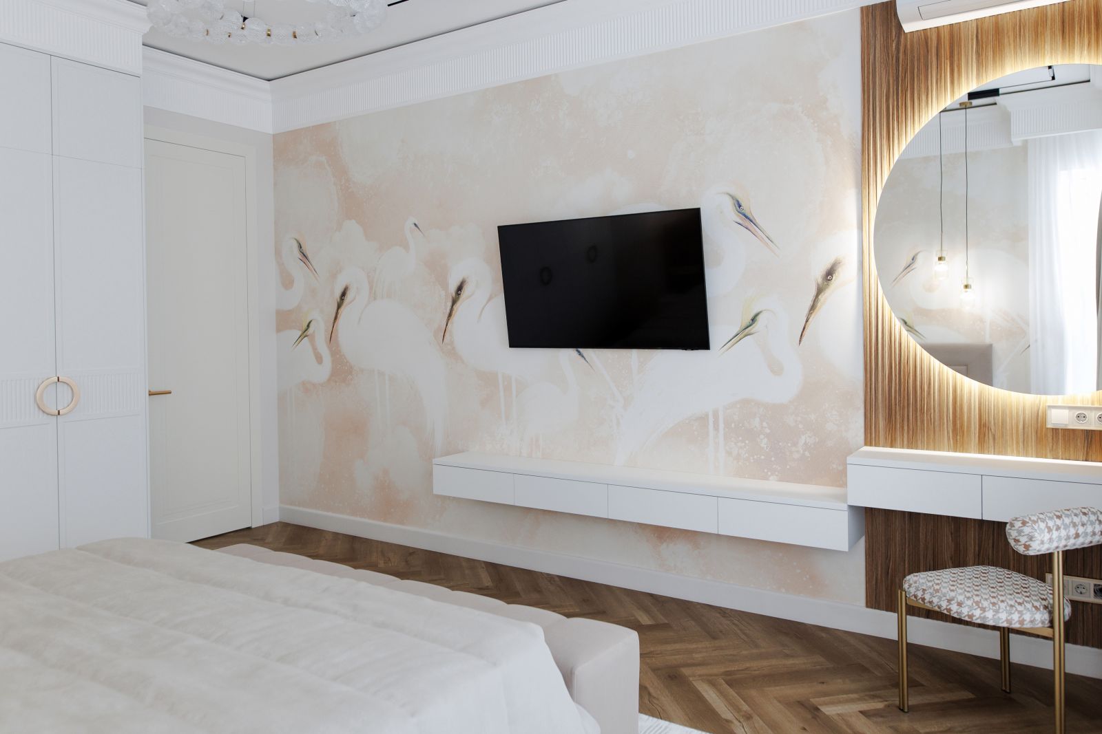Если вы в поиске вдохновения для оформления спальни и обожаете добавлять в интерьер природные нотки,  тогда этот пример от нашего клиента Досановой Дании точно для вас! Посмотрите, как эффектно она преобразила ТВ-зону и стену за изголовьем кровати, выбрав ECO фреску «Бархат» с изображением изящных цапель (Арт. 34683) из нашей дизайнерской коллекции «Animality»!