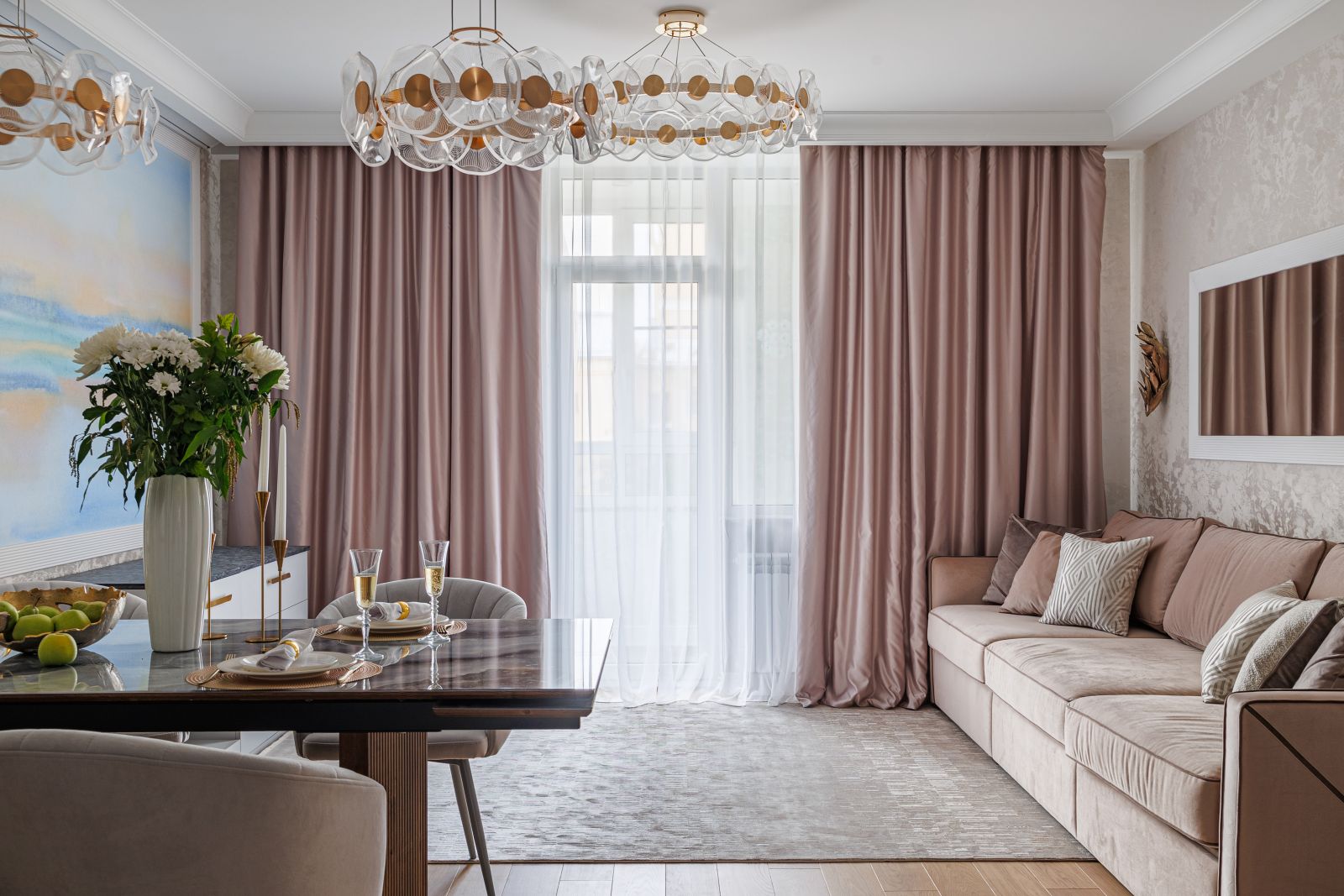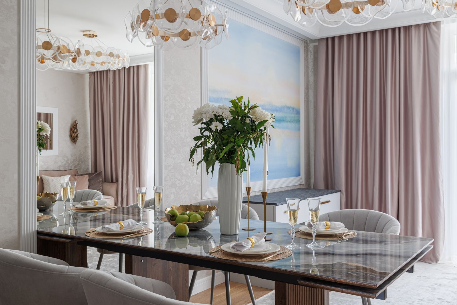 Добро пожаловать в интерьер, где каждый день начинается с персонального рассвета… Почему именно рассвет? А потому, что дизайнер Любовь Луковникова для этого пространства выбрала сюжет (Арт. 35182) на ECO фреске с эффектом градиента из нашей дизайнерской коллекции «Pastel». Этот изысканный мотив напоминает о том, как нежно просыпается природа, как первые лучи солнца касаются земли, окрашивая небо в пастельные тона. Взгляните, как оттенки перетекают один в другой, словно акварель, размытая легким дыханием ветра.