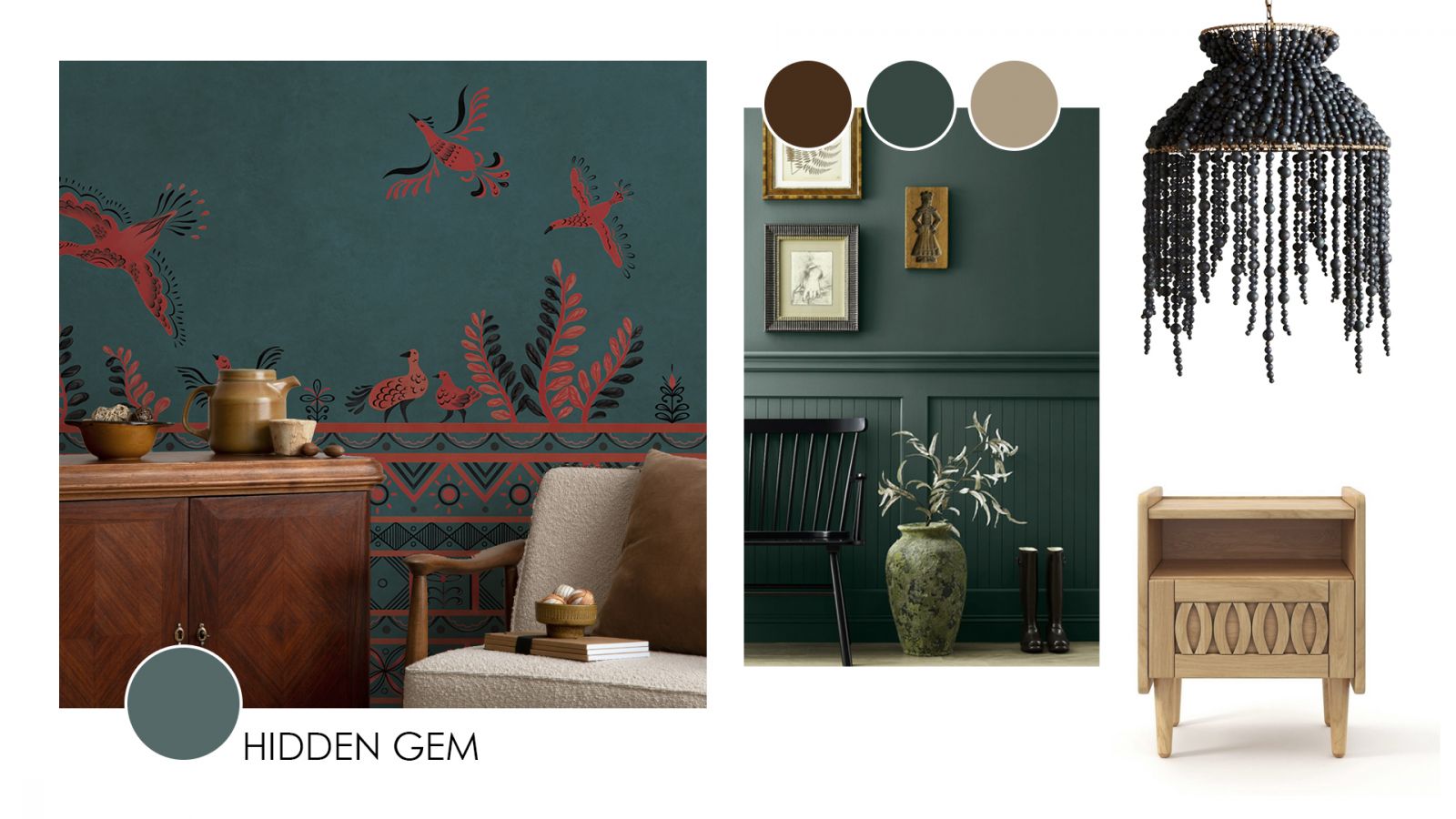 Hidden Gem – это необычный новый дымчато-нефритовый оттенок. Идеальный нейтрал для тех, кто хочет привнести в пространство свежесть и цвет без ощущения драматизма и вычурности. Он глубокий и утончённый, с неким намёком на таинственность. Зелёный цвет Hidden Gem хорошо проявит себя не только в качестве базы при оформлении спальни, ванной, гостиной, но и акцента абсолютно в любом другом помещении. Кстати, именно этот уникальный оттенок стал главным цветом 2026 года у производителя интерьерной краски Behr.